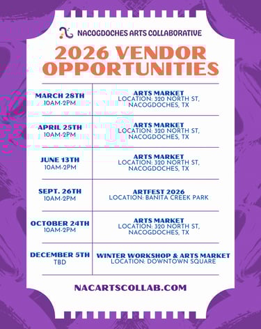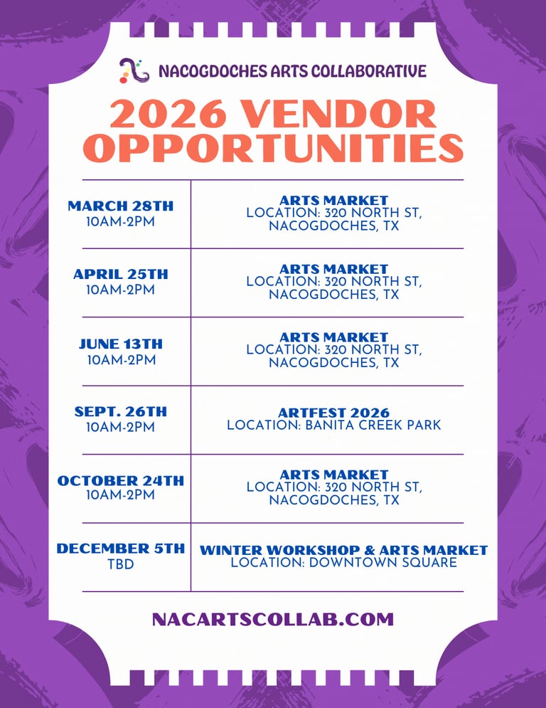 Vendor fees are considered a donation to the Nacogdoches Arts Collaborative (NAC), a 501(c)(3) nonprofit organization based in Nacogdoches. These funds directly support NAC’s arts programming, community events, and efforts to increase access to the arts in our region.